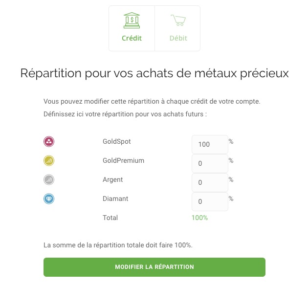 Pour ma part j’ai choisi une répartition en 100% sur le GoldSpot :