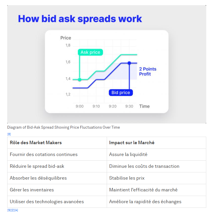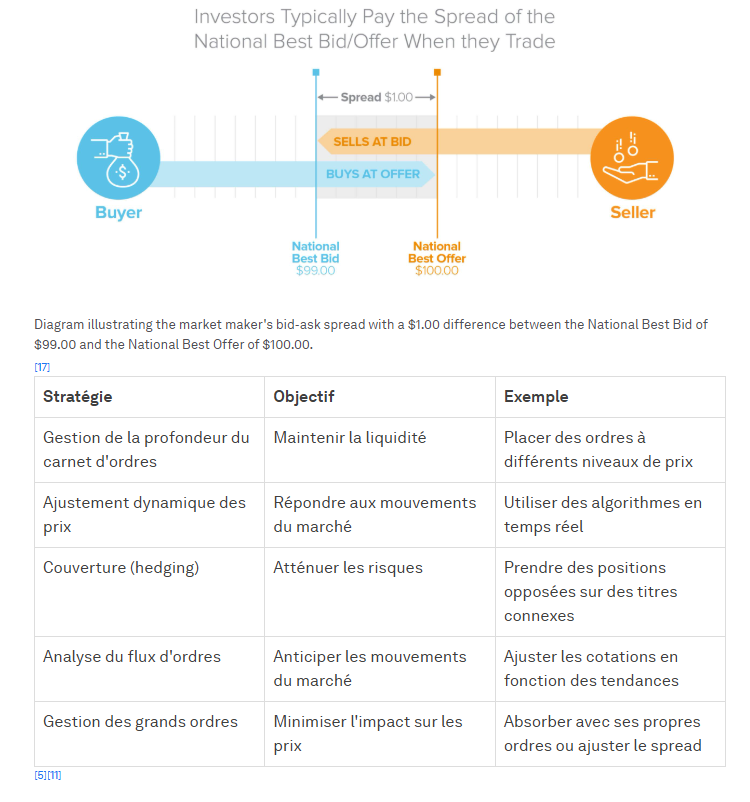 En maintenant un large inventaire de titres et en étant prêts à acheter et vendre à des prix cotés publiquement, les market makers garantissent que les transactions peuvent être exécutées rapidement et efficacement. Ils utilisent des algorithmes sophistiqués et des stratégies de trading pour gérer leurs inventaires et leurs risques, visant à tirer profit de l’écart entre les prix d’achat et de vente, appelé spread.[2][5][3][4]