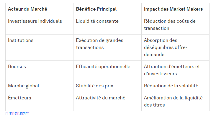 Les market makers jouent un rôle crucial pour divers acteurs du marché financier. Pour les investisseurs individuels, ils assurent une liquidité constante, permettant d’acheter et de vendre des titres rapidement et efficacement, même dans des marchés peu actifs. Cette liquidité se traduit par des spreads bid-ask plus étroits, réduisant ainsi les coûts de transaction pour les petits investisseurs.[2][1][18][6][3]