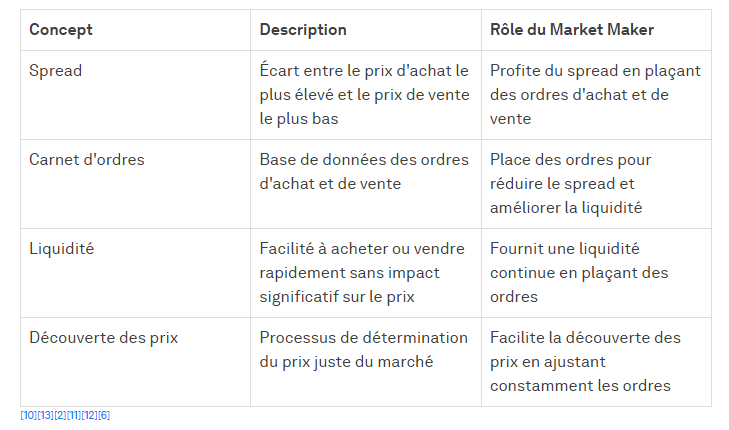 Le carnet d’ordres, quant à lui, est une base de données centralisée contenant tous les ordres d’achat et de vente soumis par les traders. Les market makers utilisent ce carnet pour placer leurs ordres, contribuant ainsi à réduire le spread, à améliorer la liquidité et à atténuer la volatilité en s’assurant qu’il y a toujours une contrepartie pour les transactions. Ce mécanisme permet un mouvement continu du marché, la découverte des prix et l’exécution de stratégies de trading complexes.[13][11][12][6]