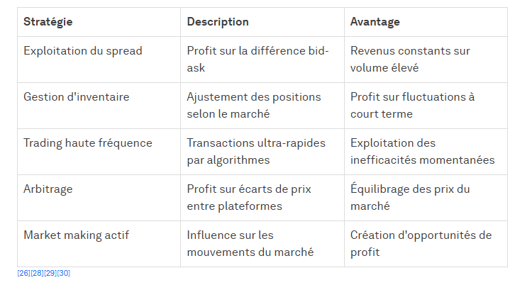 Les market makers dans le monde des cryptomonnaies utilisent diverses stratégies pour générer des profits, tout en faisant face à des risques spécifiques. La principale source de revenus provient de l’exploitation du spread, c’est-à-dire la différence entre le prix d’achat (bid) et le prix de vente (ask) des actifs. En plaçant continuellement des ordres d’achat et de vente, les market makers captent ce spread sur un grand nombre de transactions, accumulant ainsi des profits même sur des marges étroites.[26][27][28][29][30]