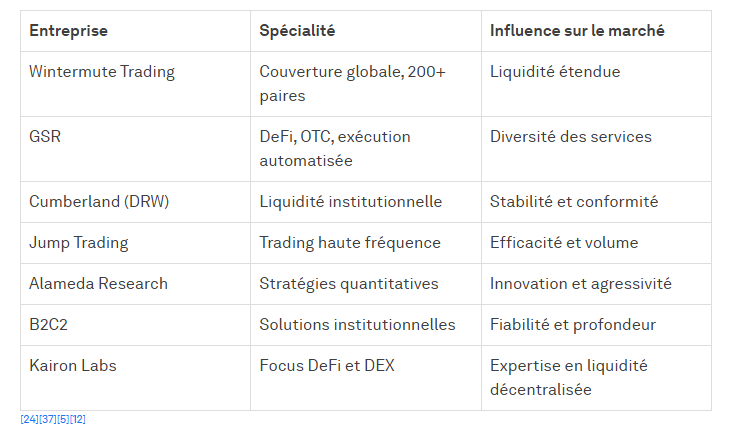 Le secteur du market making dans l’industrie des cryptomonnaies est dominé par plusieurs entreprises et institutions financières de premier plan, chacune jouant un rôle crucial dans la fourniture de liquidité et l’efficacité du marché. Parmi les acteurs majeurs, on trouve Wintermute Trading, reconnue pour sa présence mondiale et sa couverture de plus de 200 paires de crypto-actifs sur diverses plateformes d’échange. GSR est un autre acteur important, opérant sur plus de 60 échanges centralisés et décentralisés, et offrant des services de liquidité DeFi, de trading OTC et d’exécution automatisée.[24][37][5][12]