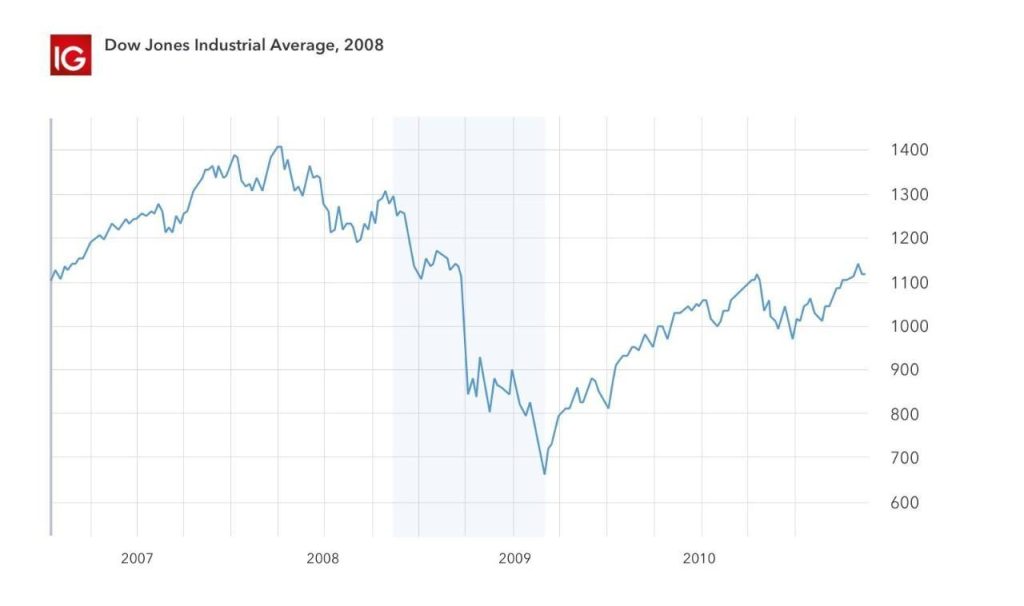 La chute approximative de l’indice S&P 500 pendant la crise financière de 2008, malgré la diversification des entreprises qui le composent