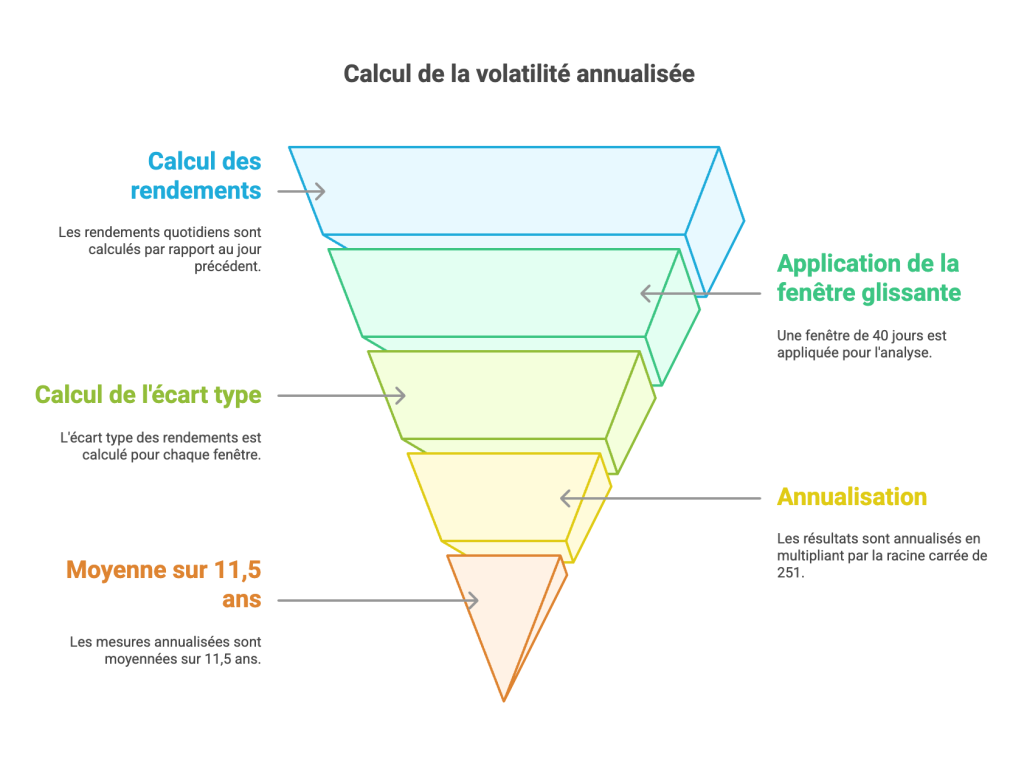 3. Pour chaque fenêtre, on calcule l’écart moyen des rendements par rapport à leur moyenne