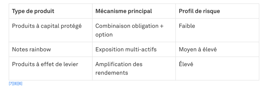 Les produits structurés offrent une variété d’options d’investissement adaptées à différents profils de risque et objectifs financiers. Parmi les types les plus couramment utilisés, on trouve les produits à capital protégé, les notes rainbow et les produits à effet de levier. Chacun de ces produits présente des mécanismes uniques pour gérer le rendement et le risque.[1][7][5]