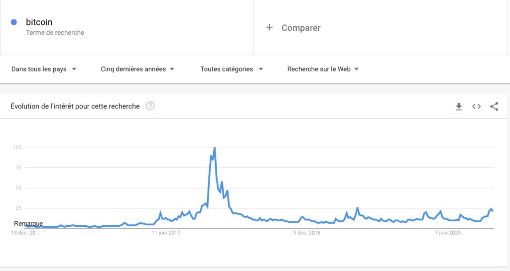 Si vous prenez Google Trends, qui vous permet de connaître le volume de recherche sur certains mots clés, voici ce que ça donne sur le terme BITCOIN :